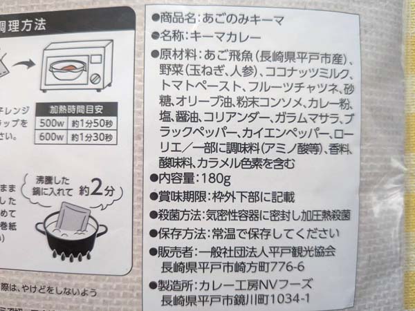 あご飛魚(長崎県平戸市産)、野菜(玉ねぎ、にんじん)、ココナッツミルク、トマトペースト、フルーツチャツネ、砂糖、オリーブ油、粉末コンソメ、カレー粉、塩、醤油、コリアンダー、ガラムマサラ、ブラックペッパー、カイエンペッパー、ローリエ/一部に調味料(アミノ酸など)、香料、調味料、カラメル色素を含む
