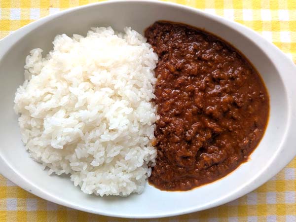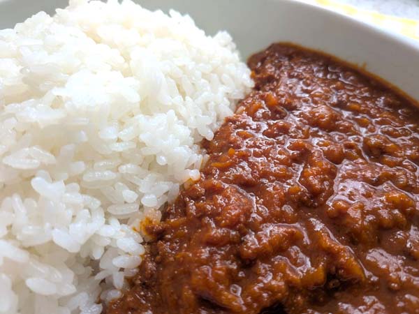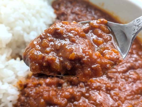 そぼろの見た目のキーマカレー。口の中に入れるとまず、甘さを感じ、そのあとにスパイスの香り、辛さが広がります。最初甘口かなと思いましたが、しっかり中辛です。じんわりと額に汗が出ます。