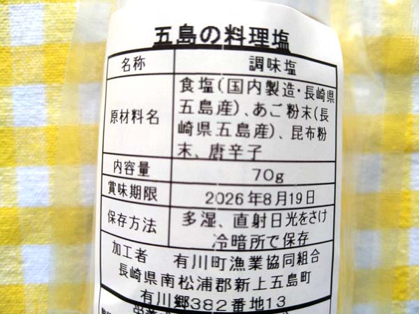 食塩(国内製造・長崎県五島産)、あご粉末(長崎県五島産)、昆布粉末、唐辛子