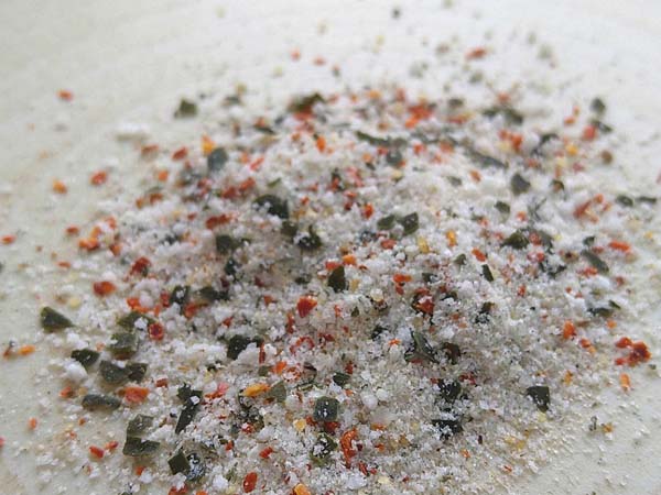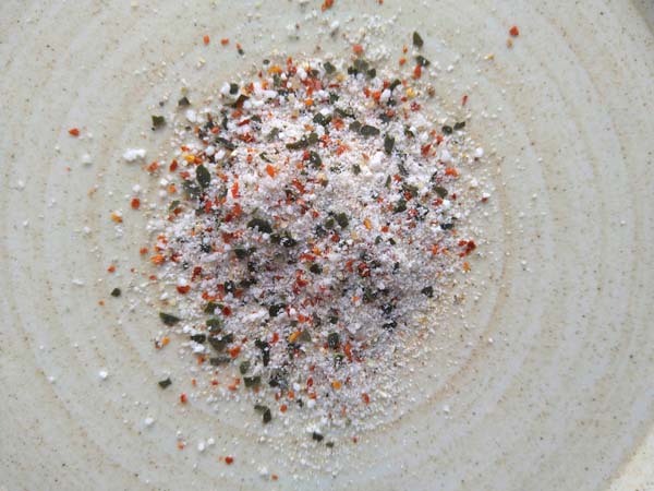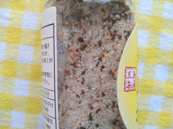 中を見ると塩だけではなく、昆布や唐辛子が見えます。あご粉末は塩と混ざり合って見た目には分からないですね。