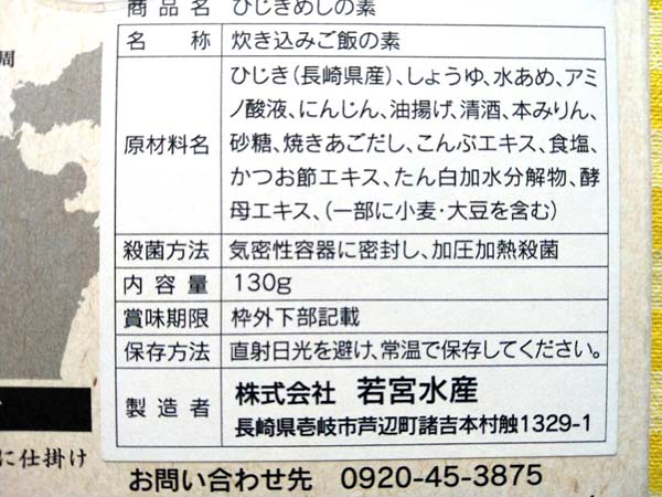 ひじき(長崎県産)、しょうゆ、水あめ、アミノ酸液、にんじん、油揚げ、清酒、本みりん、砂糖、焼きあごだし、こんぶエキス、食塩、かつお節エキス、たんぱく加水分解物、酵母エキス(一部に小麦・大豆を含む)