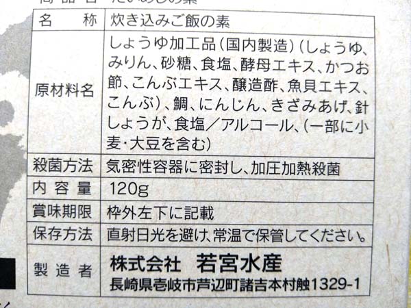 しょうゆ加工品(国内製造)(しょうゆ、みりん、砂糖、食塩、酵母エキス、かつお節、こんぶエキス、醸造酢、魚貝エキス、こんぶ)、たい、にんじん、きざみあげ、針しょうが、食塩/アルコール(一部に小麦・大豆を含む)