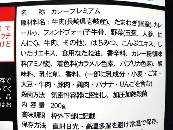 牛肉(長崎県壱岐産)、たまねぎ(国産)、カレールゥ、フォンドヴォー(小牛骨、野菜(玉葱、人参、にんにく)、牛肉、その他)、はちみつ、こんぶエキス、しいたけエキス、食用なたね油、香辛料、カレー粉/調味料(アミノ酸)、着色料(カラメル色素、パプリカ色素)、酸味料、乳化剤、香料、(一部に乳成分・小麦・ごま・大豆・牛肉・豚肉・鶏肉・バナナ・りんご含む)