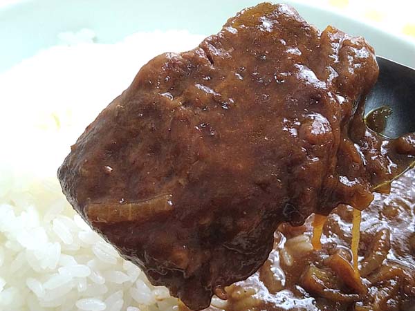デカ!ルーを入れようとすると、ゴロっと壱岐牛が出てきます。大きな塊以外にも小さ目の(とはいっても普通のレトルトカレーと比べると大きめ)壱岐牛の塊があります。