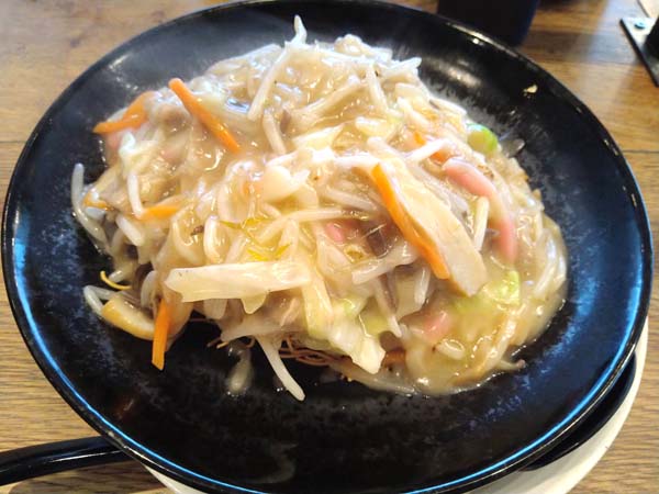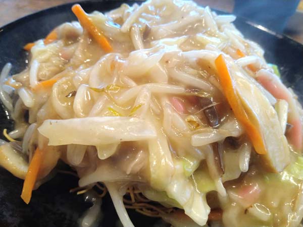 普通の皿うどんよりも、餡に水気が少なく、粘度が強いタイプです。