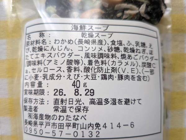 長崎県産焼あごと、わかめを使用し、その他も全て国産具材を使用した海鮮スープ 焼あご風味