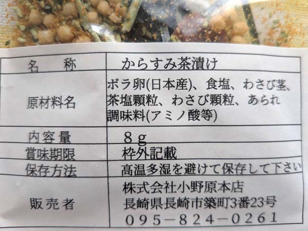ボラ卵(日本産)、食塩、わさび茎、茶塩顆粒、わさび顆粒、あられ、調味料(アミノ酸等)