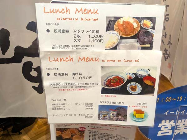 アジフライ定食と漬け丼がありましたが、前回漬け丼(天然ぶり)を食べたので、今回はアジフライ定食にします。