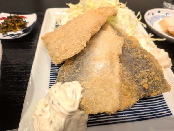 アジフライが2枚なら1,000円、3枚なら1,100円です。100円しか差がないので、3枚を選択。