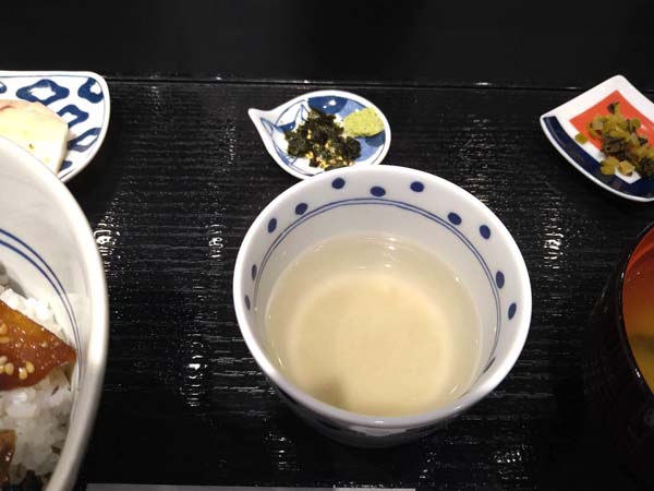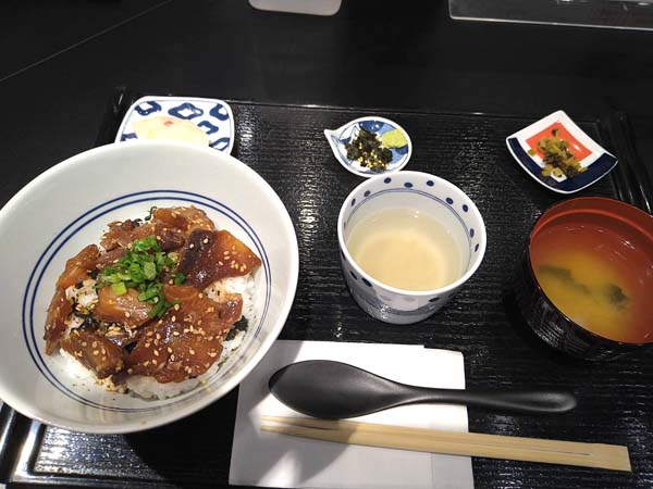 天然ぶりの漬け丼に、味噌汁、お新香、小鉢、お茶漬け用あごだしが付いています。