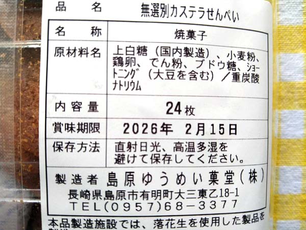 せんぺいに、手焼きカステラせんぺいと書かれていますが、中にははっきりと見えないものもあります。しっかり文字が分からないから無選別ということ?