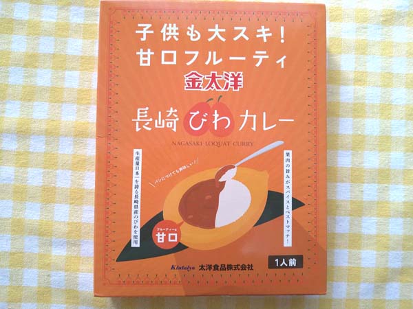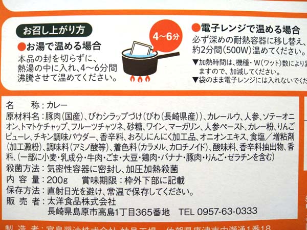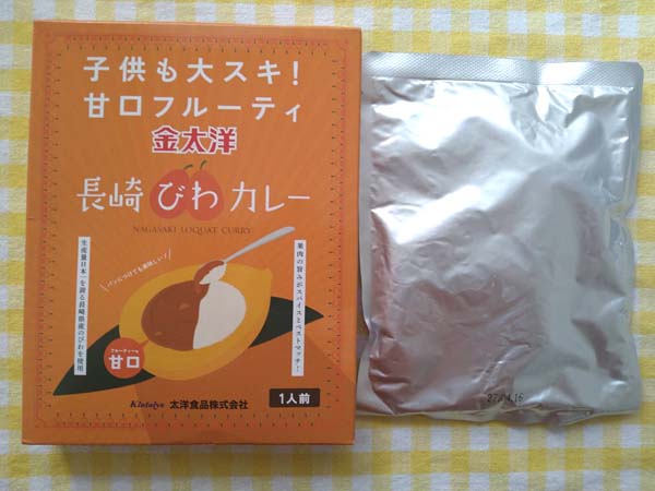 豚肉(国産)、びわシラップづけ(びわ(長崎県産))、カレールウ、人参、ソテーオニオン、トマトケチャップ、フルーツチャツネ、砂糖、ワイン、マーガリン、人参ペースト、カレー粉、りんごピューレ、チキン調味料パウダー、香辛料、おろしにんにく加工品、オニオンエキス、食塩/増粘剤(加工澱粉)、調味料(アミノ酸等)、着色料(カラメル、カロチノイド)、酸味料、香辛料抽出物、香料、(一部に小麦・乳成分・牛肉・ごま・大豆・鶏肉・バナナ・豚肉・りんご・ゼラチンを含む)