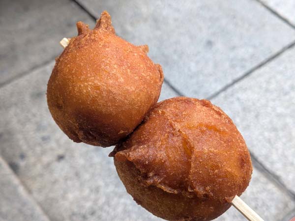 じゃがいもを柔らかく蒸して、衣をつけて揚げています。