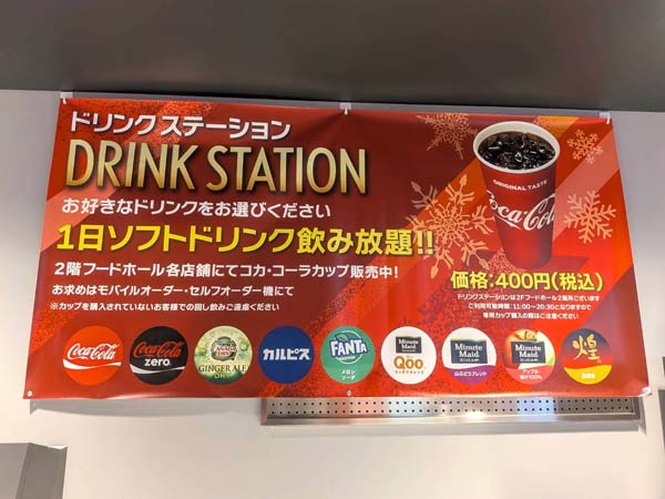 長崎スタジアムシティには、ドリンクステーションもあります。なんと400円で1日ソフトドリンク飲み放題です。