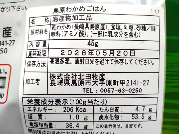 乾わかめ(長崎県島原産)、食塩、乳糖、砂糖/調味料(アミノ酸)、(一部に乳成分を含む)
