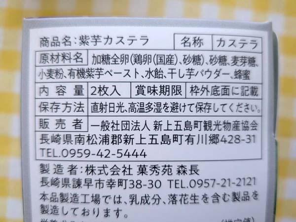 加糖全卵(鶏卵(国産)、砂糖)、砂糖、麦芽糖、小麦粉、有機紫芋ペースト、水飴、干し芋パウダー、蜂蜜