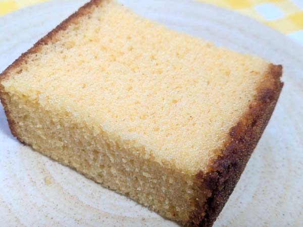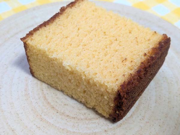 他のカステラと違い、少しずっしりとした食感。少し軽羹っぽいくちどけです。