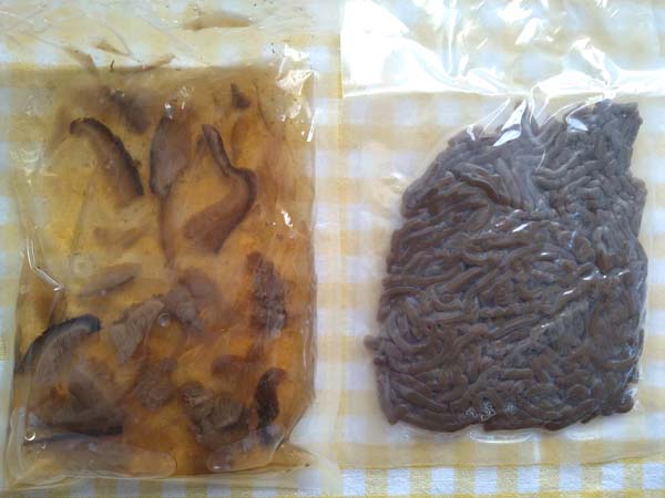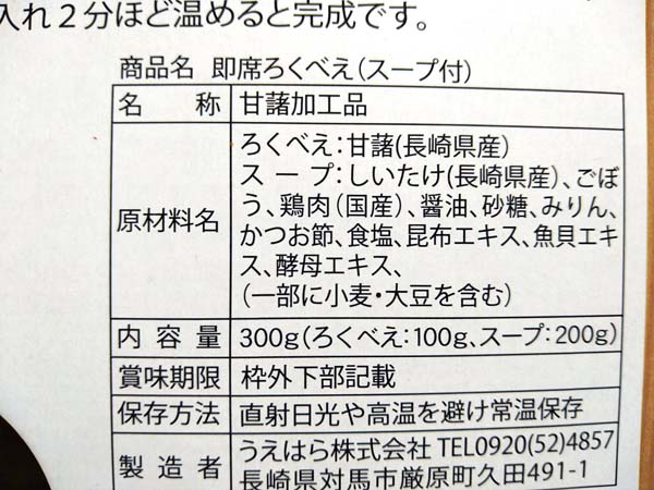 スープ:しいたけ(長崎県産)、ごぼう、鶏肉(国産)、醤油、砂糖、みりん、かつお節、食塩、昆布エキス、魚貝エキス、酵母エキス、(一部に小麦、大豆を含む)