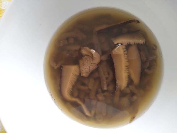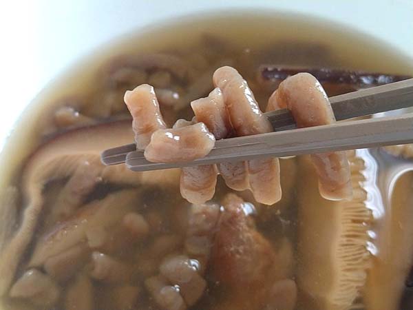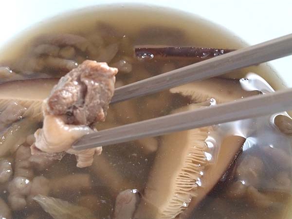 スープには、しいたけや、ゴボウ、鶏肉も入っています。