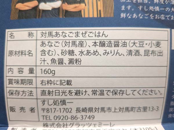 あなご(対馬産)、本醸造醬油(大豆・小麦含む)、砂糖、水あめ、みりん、清酒、昆布出汁、魚醬、澱粉