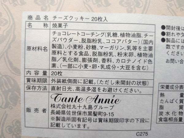 チョコレートコーチング(乳糖、植物油脂、チーズパウダー、脱脂粉乳、ココアバター)(国内製造)小麦粉、砂糖、マーガリン、乳等を主要原料とする食品、脱脂粉乳、粉末卵、植物油脂/乳化剤、膨脹剤、香料、カロテノイド色素、(一部に小麦・卵・乳成分・大豆を含む)