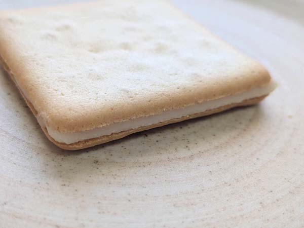 さっくり焼き上げたクッキーで、カマンベールパウダーを練り込んだホワイトチョコをサンドしています。