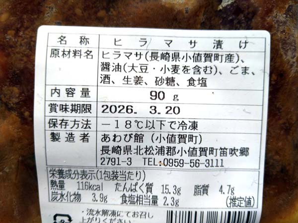 ヒラマサ(長崎県小値賀町産)、醤油(大豆・小麦を含む)、ごま、酒、生姜、砂糖、食塩