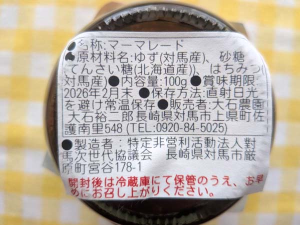 ゆず(対馬産)、砂糖(てんさい(北海道産))、はちみつ(対馬産)