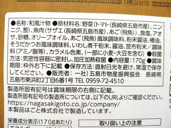 野菜(トマト(長崎県五島市産)、ニンニク、葱)、魚肉(サザエ(長崎県五島市産)、あご(飛魚))、食塩、アオサ、砂糖、オリーブオイル、あご(飛魚)風味調味料、粉末醤油、椿油、そうだかつお風味調味料、いわし煮干粉末、醤油、昆布粉末/調味料(アミノ酸等)、カラメル色素、(一部に小麦・大豆を含む)