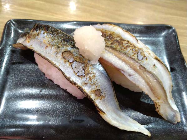 でかい秋刀魚のネタ。炙った香ばしさと脂が乗った秋刀魚が美味い。
