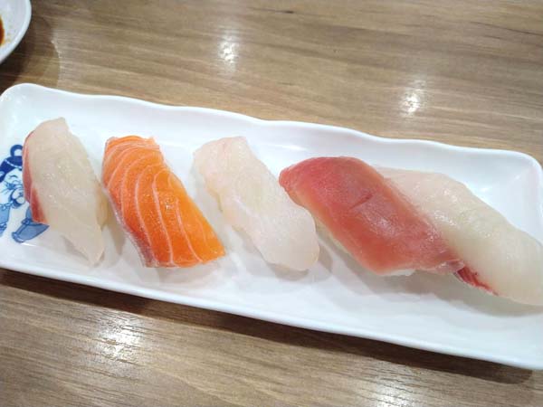 ヒラマサ、マグロ、ヒラメ、サーモン、タイの5種類が入っています。